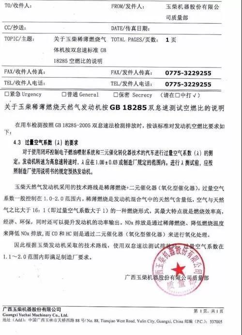 2)在雙怠速方法檢測時(shí),λ值可根據(jù)發(fā)動(dòng)機(jī)制造廠出具的文件,按照發(fā)動(dòng)機(jī)生產(chǎn)廠的限值進(jìn)行評價(jià),例:下圖是一家天然氣發(fā)動(dòng)機(jī)生產(chǎn)廠家出具的λ限值證明文件。